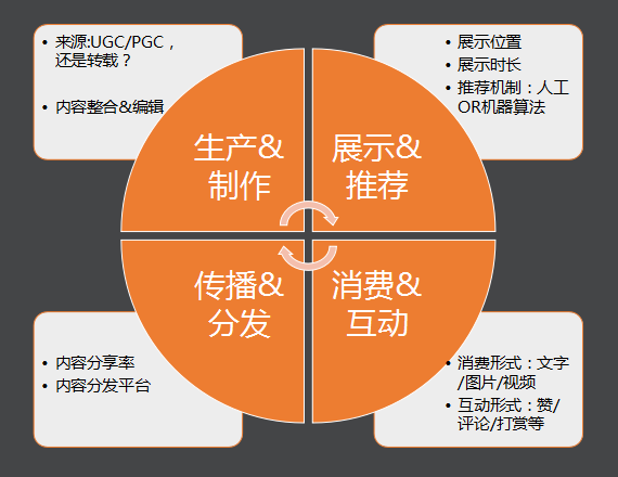 好了,关于社区内容的重要性,先说到这。关于社区内容的整个流程,个人认为主要是以下 4 步:生产&制作>展示&推荐>消费&互动>传播&分发。