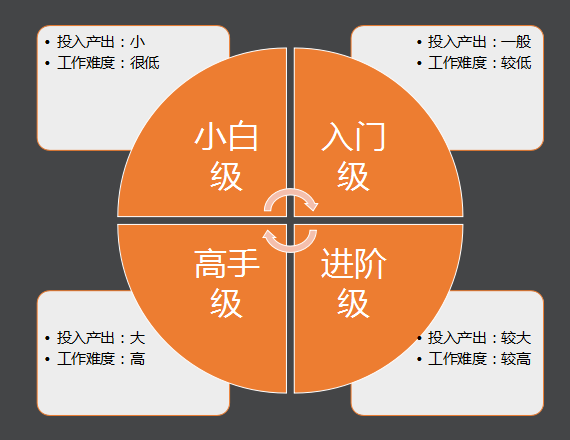 通过以上举例,我并不是说“小白级”和“入门级”工作是没有必要做的,毕竟这是基础,只是想建议每个运营人(包括我自己),不要一味地再沉溺于“回个马甲”等人肉工作,而是开始考虑熟悉产品、深入运营等,注重运营工作的投入产出比,能用更高效的方式。