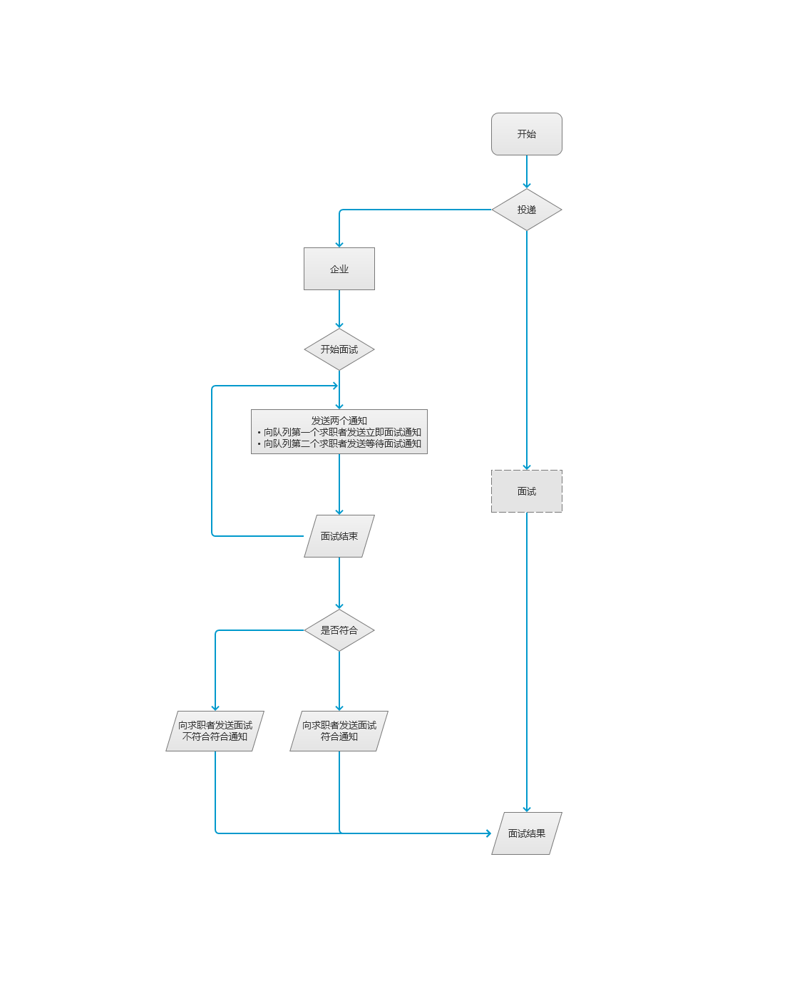 针对以上四个问题,设计出如下流程(省略取号的环节,主要核心的流程是企业的发送通知循环以及面试后的符合不符合操作循环)