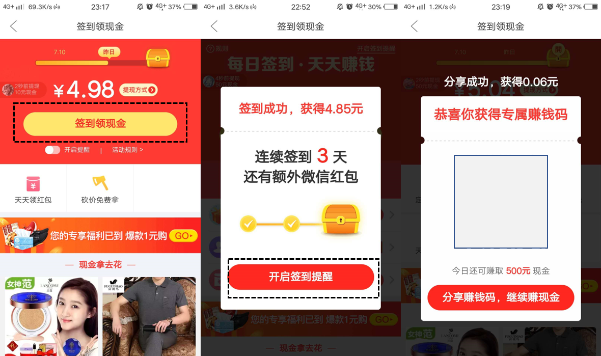用户在完成签到功能一共涉及到签到提醒的引导以及邀请用户签到的引导,但全程都没有跳转出页面,用户无意识的就被拼多多引导了。