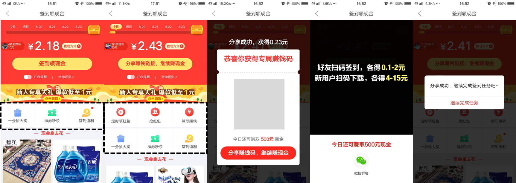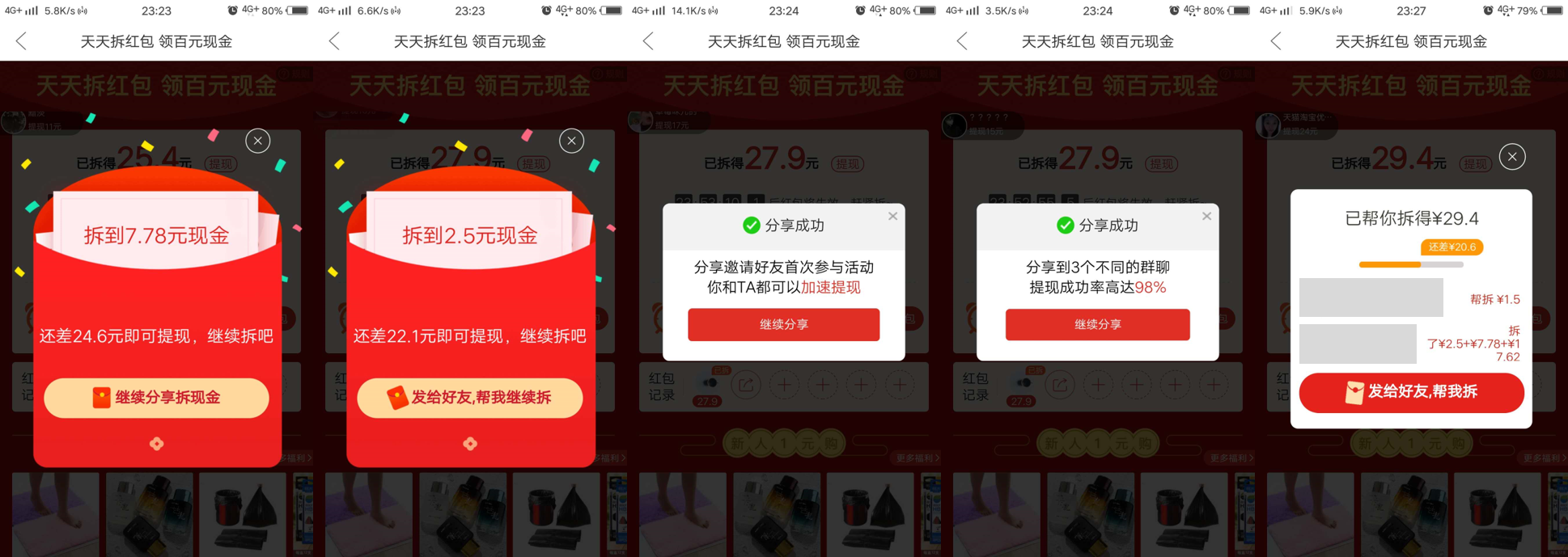 拼多多其中一个产品叫天天领红包,用户分享出去,其他人可以帮忙拆红包。邀请拆红包的好友越多,拆的金额也越多。但你会发现:前几个用户拆的金额都相当可观,特别是新用户,会给用户造成一种假象:我再继续邀请两三个好友帮我点一下,就可以完成任务了。