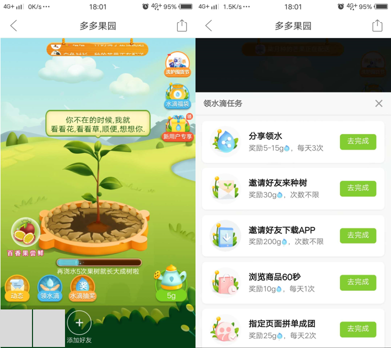 社交链下的利益驱动最终带来了用户自驱获客,水滴供养大树。水滴作为多多果园唯一的货币标准,如何获得水滴就是产品设计中的重中之重。