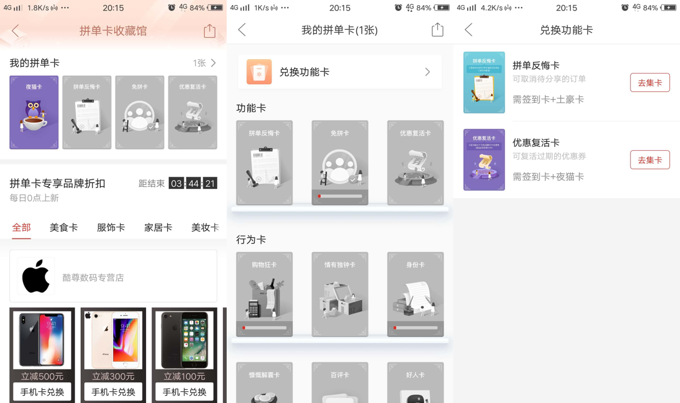 如何获得优惠以及以怎样的形式获得优惠才是设计者需要考虑的事情,拼单卡收藏馆以业务为依托,集卡为形式引导用户完成特定操作,同时还可以像好友索要特定卡片,集卡成功后连所谓的后悔药都可以使用。