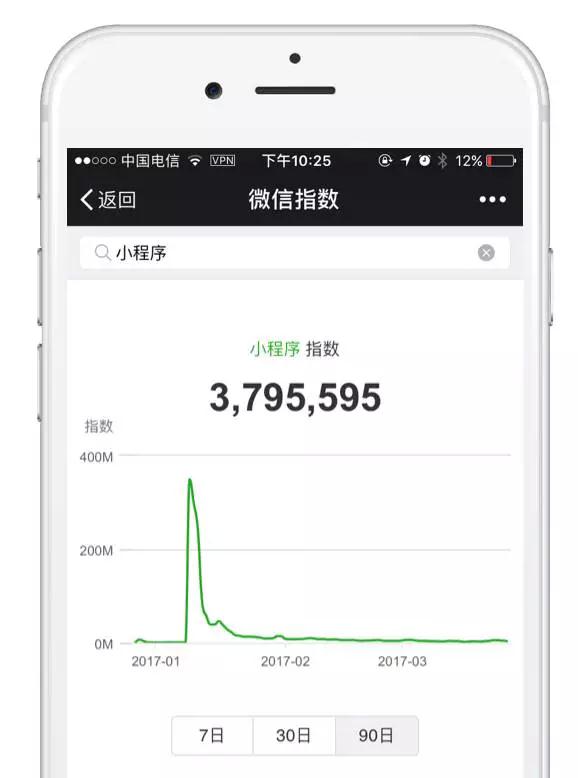 那么,几个月过去了,这个构想实现得如何?诚恳地说一句,并不怎么样。或许这样的现状是微信团队预料到的,他们正在按原计划一步一步开放更多能力;也或许,事情有点低于他们的期望,他们也必须逐步开放更多能力,甚至改变一点点原来的构想,让小程序走上更快的轨道。从微信指数,可以看到,小程序没有 1 月份那么火了: