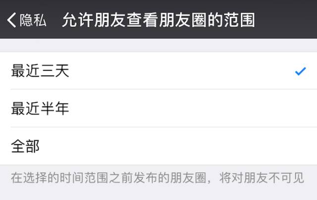 阅后即焚:以前大家靠手动完成,一条条发完之后删掉或者设为私密,这样可以不让别人看到。现在有了朋友圈半年内容可见,三天可见的选项,则直接满足了这样的需求。