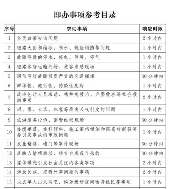 具体来说,像供水、供电、供气、供暖故障,公共交通出行及乘客求助;各类政策咨询问题;可能引发或危及群众生命财产安全的市政设施、道路安全、工业生产、交通运输、食品安全、医疗卫生、公安消防涉及政府部门履行职能方面的问题等,都属于即办事项。