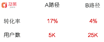 举个例子,电商平台X宝的购买商品的路径有A、B两条,两条路径的转化率和用户数如下图所示: